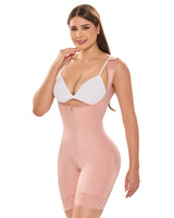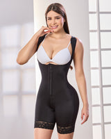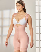 Su diseño tipo media pierna con encaje siliconado evita que se enrolle o deslice. Además, cuenta con broches en los hombros para mejor soporte, cierre frontal y cremallera perineal para máxima comodidad durante el día.